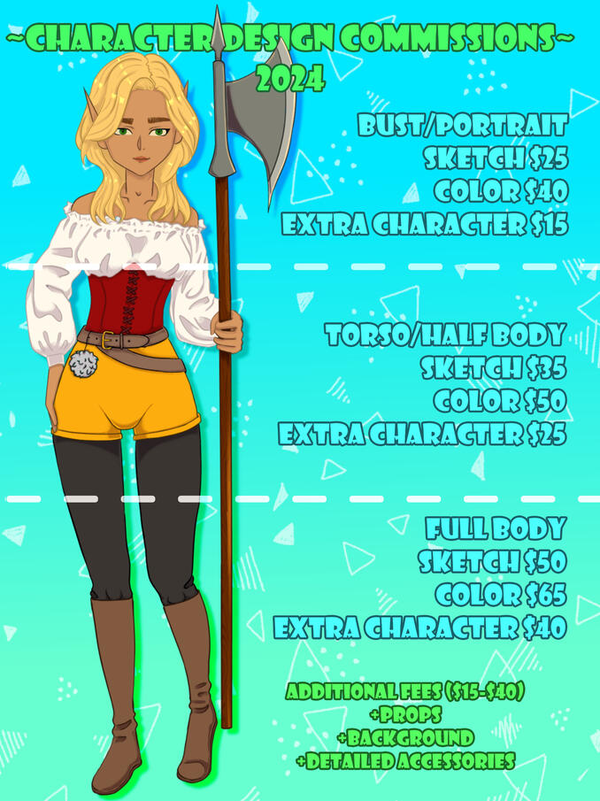 Commission Type - I am open to taking on commissions for art I don't have listed and am willing to negotiate pricing for commission that are not listed. Here you can also let me know in more detail the design you would like to get